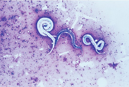 1. Цитология (фистулезный экссудат): эозинофилы, нейтрофилы, макрофаги и личинки нематод длиной 500 мкм с заостренными хвостами.