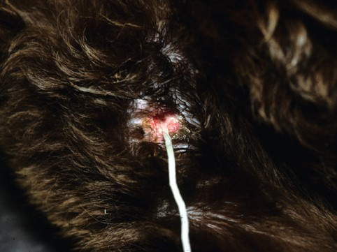 Дракункулез - это кожное заболевание, вызываемое Dracunculus, нематодой, паразитирующей в подкожных тканях. Заражение происходит, когда млекопитающее - хозяин проглатывает инфицированного микроскопического ракообразного (промежуточного хозяина), употребляя загрязненную воду. В течение следующих 8-12 месяцев личинки развиваются во взрослых особей в подкожной клетчатке млекопитающего-хозяина. В Северной Америке Dracunculus insignis в основном паразитирует на енотах, норках и других диких млекопитающих, при этом заражение собак и кошек встречается редко. В Африке и Азии D. medinensis (ришта) поражает многих млекопитающих, включая собак, лошадей, крупный рогатый скот и людей.