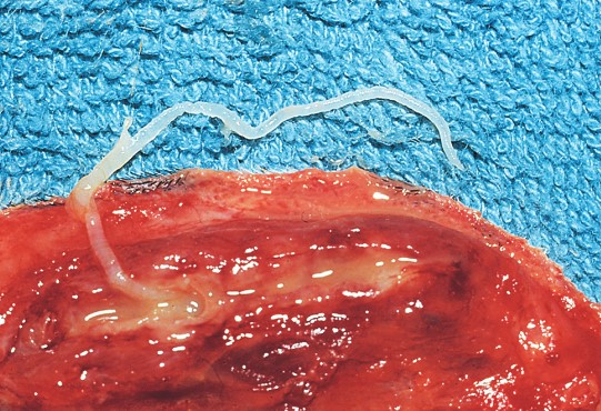 2. Дерматогистопатология: подкожная псевдокиста, содержащая взрослых и личиночных нематод, окруженных тканью с эозинофильным пиогранулематозным воспалением.