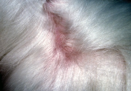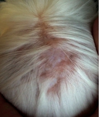Фото 3 Алопеция от вытягивания у собак. Та же собака с фото 2. Фокальная алопеция и эритема, вызванные постоянным вытягиванием волос.