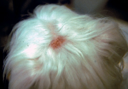 Фото 1 Алопеция от вытягивания у собак. Обратите внимание на эритематозный участок алопеции, вызванный заколкой, использованной для стягивания волос у мальтийской болонки.
