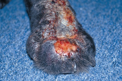 Фото 8 Бактериальный пододерматит у собак и кошек. Диффузное облысение, эритема и припухлость поражали большую часть кожной поверхности. В этом тяжелом случае также имелись множественные эрозии и свищевые поражения вокруг когтевых лож и в межпальцевых пространствах.