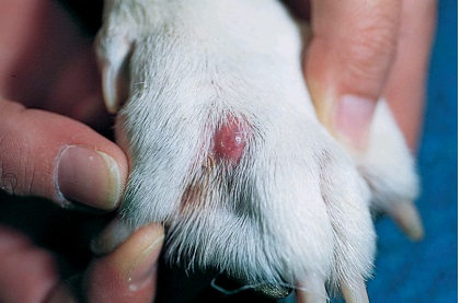 Фото 4 Бактериальный пододерматит у собак и кошек. Эта межпальцевая киста (фурункулез лап) была обнаружена только после того, как пальцы были разведены и было обследовано межпальцевое пространство.