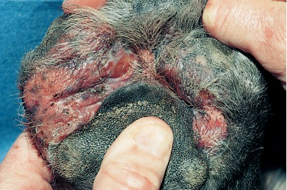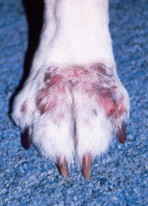 Фото 6 Бактериальный пододерматит у собак и кошек. Выраженный отек с облысением, эритемой и эрозиями. Эта инфекция наблюдалась вторично к аллергическому дерматиту.