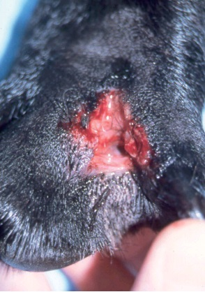 Фото 7 Бактериальный пододерматит у собак и кошек. Эта хроническая межпальцевая фистула и свищевой ход (фурункулез лап) были вызваны проникновением инородного тела растительного происхождения.