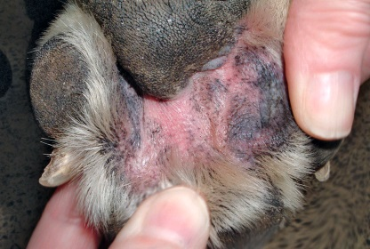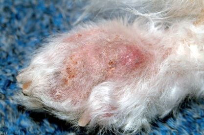 Фото 3 Бактериальный пододерматит у собак и кошек. Облысение и корковый папулярный дерматит, который возник в межпальцевом пространстве и распостранился на дорсальную поверхность лапы. Эта бактериальная инфекция наблюдалась вторично к лежащей в ее основе аллергии. Обратите внимание, что поражение сходно с малассезионным дерматитом.