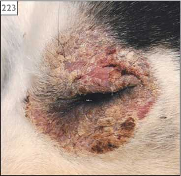 Фото 6 Цинк-зависимый дерматоз собак.. Выраженная алопеция, воспаление, корки вокруг глаза.