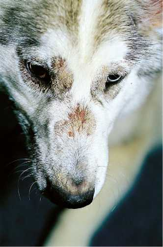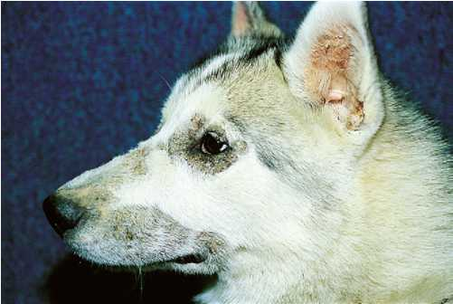 Фото 1 Цинк-зависимый дерматоз собак. Алопеция и кератотические блюшки на морде молодой взрослой сибирской хаски.