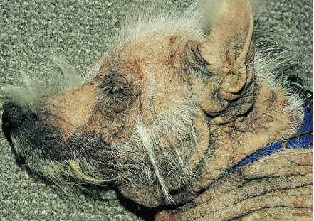 Фото 4 Эпидермальная дисплазия вест хайленд уайт терьеров. Алопеция, лихенификация и гиперпигментация, поражающие морду. Корковый папулярный дерматит был вызван вторичной поверхностной пиодермией
