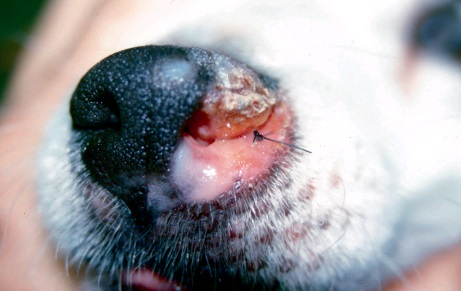 Фото 5 Эпителиотропная лимфома у собак и кошек. Односторонняя депигментация, изьязвление и тканевая деструкция носового зеркала у собаки. Обратите внимание на схожесть с аутоиммунным заболеванием кожи, васкулитом и медикаментозным дерматитом.