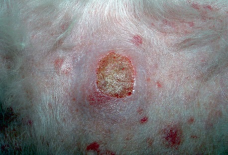 Фото 11 Эпителиотропная лимфома у собак и кошек. Большое корковое изьязвленное поражение на животе. Обратите внимание на окружающие эритематозные папулярные поражения, которые можно легко спутать с фолликулитом.