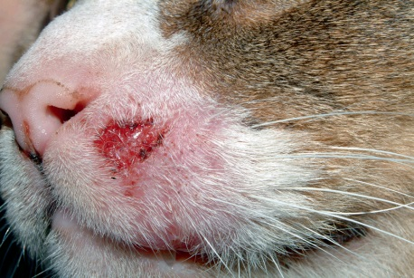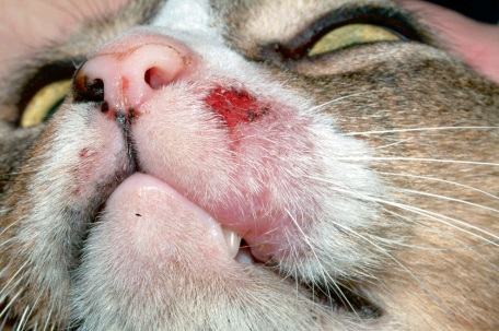 Фото 3 Эпителиотропная лимфома у собак и кошек. Фокальные изьязвленные поражения с алопецией на губе кошки. Обратите внимание, что вся губа увеличена в обьеме, что вызывается инфильтрацией неопластическими клетками.