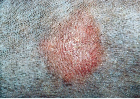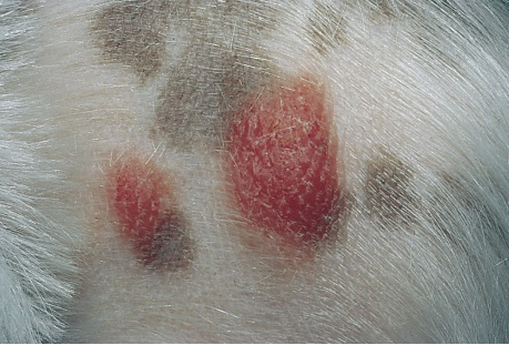 Фото 7 Эпителиотропная лимфома у собак и кошек. Эта эритематозные шелушащиеся бляшки типичны для слабо выраженных опухолевых поражений.