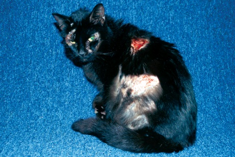 Фото 1 Эпителиотропная лимфома у собак и кошек. Множественные опухоли с облысением, корками и изьязвлением, располагающиеся по всему телу у взрослой кошки. Эта кошка ранее лечилась от аллергического дерматит без положительного ответа.