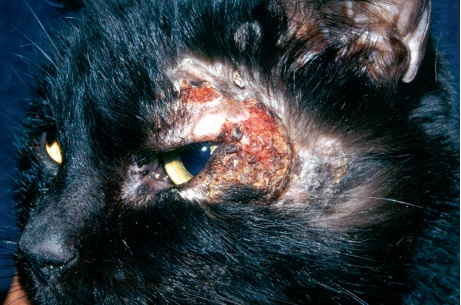 Фото 2 Эпителиотропная лимфома у собак и кошек. Та же кошка с фото1. Корковые, изьявленные поражения с облысением, окружающие глаз.