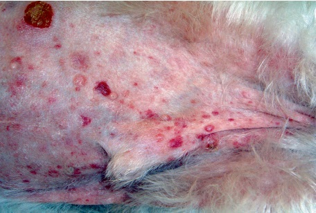 Фото 9 Эпителиотропная лимфома у собак и кошек. Множественные эритематозные папулы и узелки на животе. Обратите внимание на сходство с поражениями, вызванными фолликулитом (пиодермия, демодекоз, дерматофитоз)