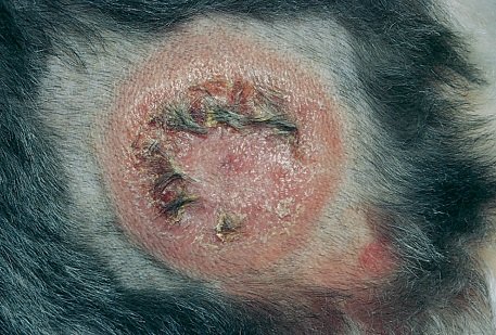 Фото 12 Эпителиотропная лимфома у собак и кошек. Эта большая эритематозная опухоль с облысением в центре имеет кратероподобный вид.
