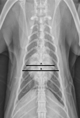 Изобр 1.Оценка процента ширины грудной клетки (A/B) на этой вентродорсальной проекции был выполнен при помощи оценки ширины силуэта сердца (A) как части ширины грудной клетки (B), на уровне, где силуэт сердца максимальной широкий. Этот метод был выполнен тем же способом для дорсовентральных проекций.