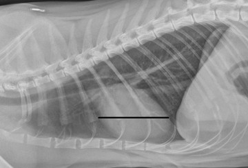 Изобр 4. Оценки размера сердца по длине грудных позвонков были выполнены в вентродорсальных проекциях, как ранее описано,[7] с длинной осью (A), проведенной от основания сердца к верхушке.