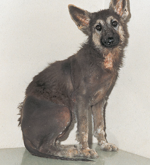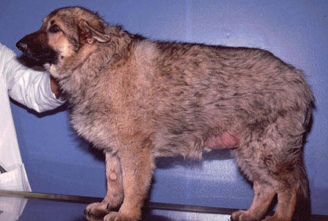 Гипофизарная карликовость наблюдается первично у немецких овчарок и карельских медвежьих собак. Больные собаки часто выглядят нормальными в течение первых 2-3 месяцев жизни. После этого времени, задержка роста и задержка щенячьей шерсти становятся очевидными (Фото 1). Позднее встречается потеря щенячьей шерсти, приводя к билатеральной симметричной алопеции в области шеи, каудолатеральных частей бедер и, иногда, туловища. Часто наблюдаются вторичные бактериальные и/или грибковые инфекции. Рост первичных волос, как правило, ограничен мордой и дистальными частями конечностей. Кожа становится гиперпигментированной, гипотоничной и могут появляться чешуйки и комедоны. Может наблюдаться атрофия семенников у самцов и анэструс у самок. Больные животные также могут демонстрировать изменения поведения, такие как агрессивность и страх. Клинические симптомы гипотиреодизма и адренокортикальной недостаточности будут наблюдаться, если имеется недостаток тиреотропного или адренокортикотропного гормонов. Это состояние, как правило, совместимо с жизнью, но большинство животных живут только 3-8 лет.