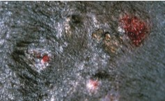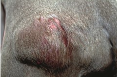 Изобр 7. Идиопатическая стерильная гранулема и пиогранулема собак. Множественные гранулемы, которые разорвались с образованием свищей, из которых выделялась серозно-геморрагическая жидкость с формированием корок.
