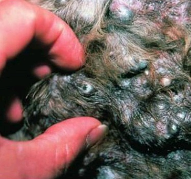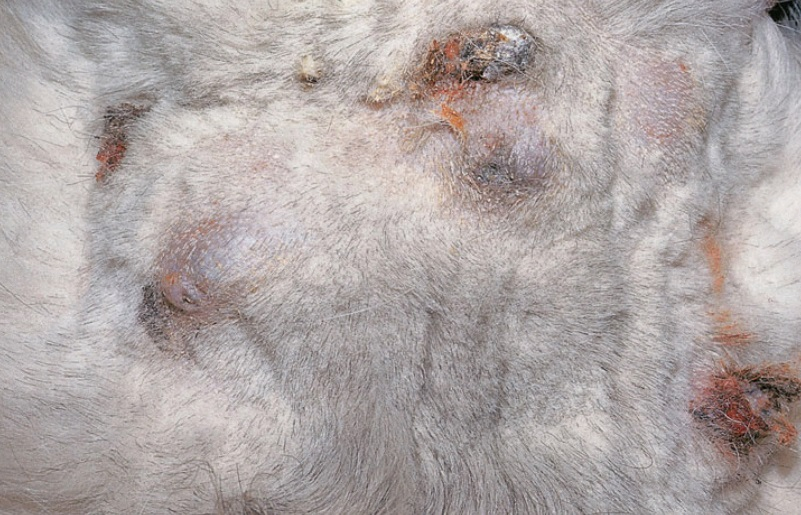 Фото 5 Инфундибулярная кератинизирующая акантома у собак.Генерализованное поражение у норвежского эклхунда. Некоторые из образований имеют видимые отверстия, открывающиеся на поверхность кожи. Отверстия заполнены кератиновыми пробками.