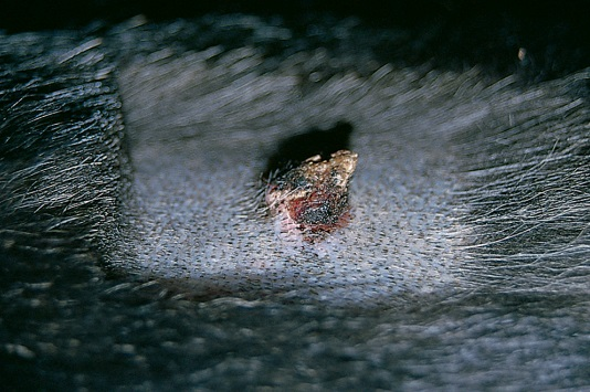 Фото 2. Инфундибулярная кератинизирующая акантома у собак. Мелкий кератиновый узелок, ассоциированный с лежащей в основе опухолью. Кератиновый узелок легко может быть принят за корку.