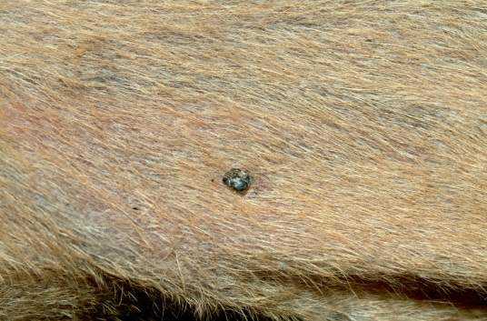 Фото 1. Инфундибулярная кератинизирующая акантома у собак. Кератоакантома на спине кеесхонда. Отверстие опухоли закупорено кератином