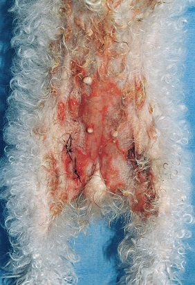 Фото 1 Кандидоз собак и кошек. Поверхностные влажные эрозивные поражения на нижней части туловища собаки.