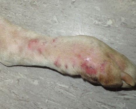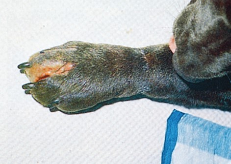 Фото 4. Кокцидиомикоз у кошек и собак. Целлюлит со слабовыраженными свищами на лапе собаки.