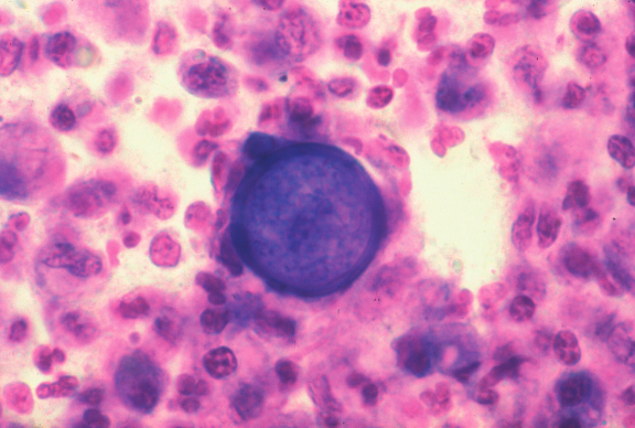Фото 2. Кокцидиомикоз у кошек и собак Микроскопическое изображение организма Coccidioides, рассматриваемое с помощью объектива 100×(масло).