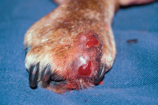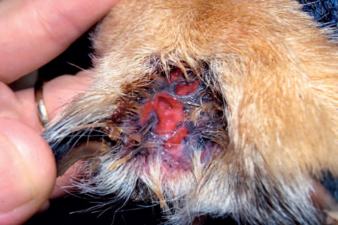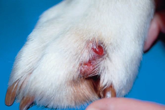 Фото 10 Межпальцевый фурункулез собак. Фокальная межпальцевая киста, которая разорвана и из нее выделяется гнойный экссудат.