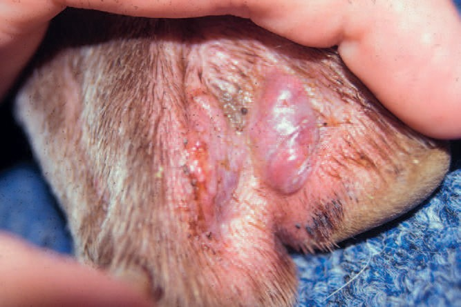Фото 2 Межпальцевый фурункулез собак. Выраженная отечность тканей в межпальцевом промежутке была вызвана травматическим фурункулезом и последующей бактериальной инфекцией.