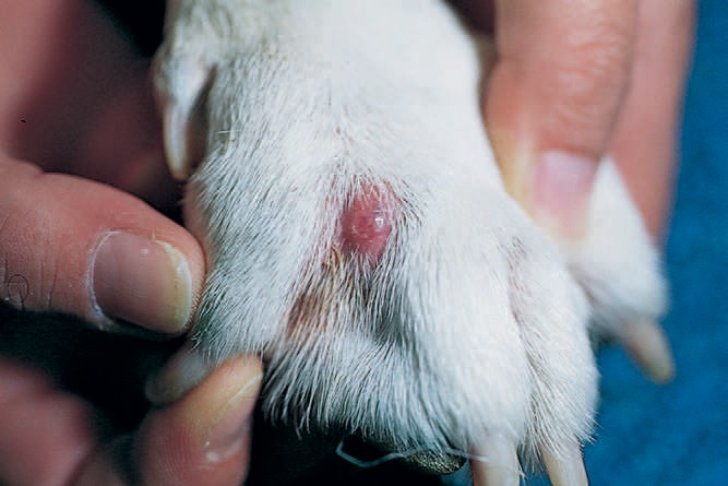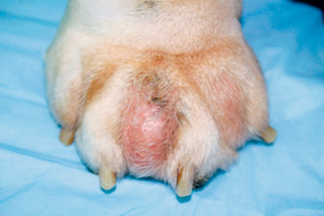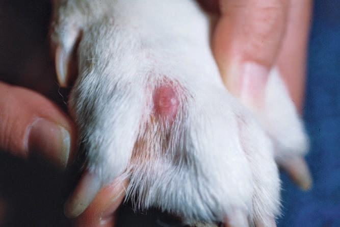 Фото 1 Межпальцевый фурункулез собак. Большая, мягкая киста в межпальцевом пространстве типична для этого заболевания