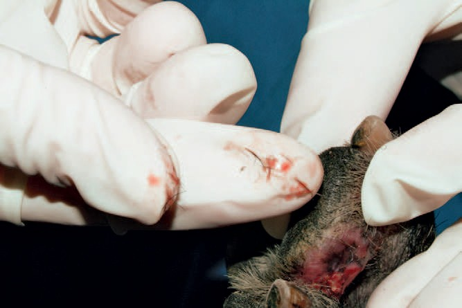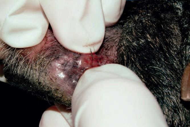 Фото 5 Межпальцевый фурункулез собак. Клиницист осторожно сдавливает латеральные части поражения, для того, чтобы продемонстрировать наличие волос в полости абсцесса. Эта техника не рекомендуется, поскольку внутреннее повреждение поражения может усилить целлюлит и рубцевание.