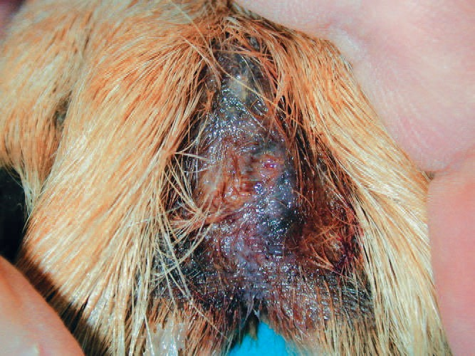 Фото 3 Межпальцевый фурункулез собак. Межпальцевая киста с наличием влажного экссудата и кровоподтеком в окружающей ткани