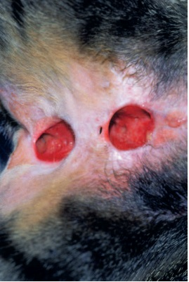 Фото 6 Нокардиоз у собак и кошек. Большие открытые язвы на животе.