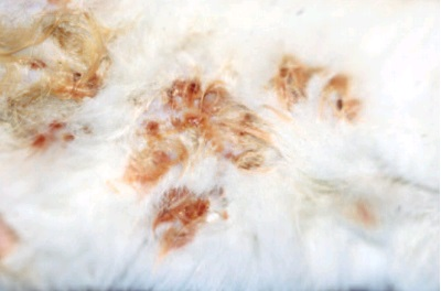 Фото 3 Нокардиоз у собак и кошек. Многочисленные язвенные дренирующиеся поражения на животе у кошки. Поражения и локализация характерны для нокардиоза и оппортунистического микобактериоза у кошек.
