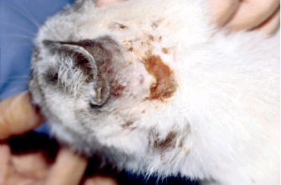 Фото 1 Нокардиоз у собак и кошек. Язвенно- корковые поражения с гнойным отделяемым на голове и основании уха у взрослой кошки
