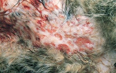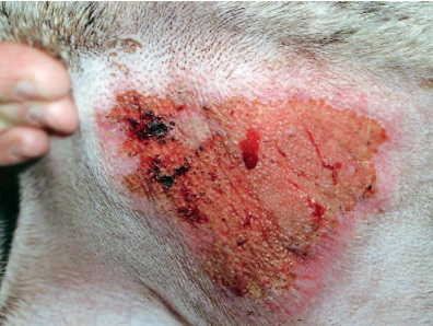 Фото 5 Нокардиоз у собак и кошек. Фокальная зона эрозивного дерматита с дренирующимися поражениями в паховой зоне взрослого серого дога. При исследовании пораженной области необходимо применение перчаток.