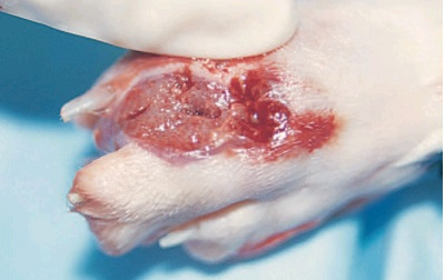 Фото 4 Нокардиоз у собак и кошек. Глубокое язвенное поражение на дорсальной поверхности лапы собаки, развившееся в течение нескольких месяцев. Глубокие свищевые тракты с тканевой пролиферацией могут наблюдаться при любой агрессивной бактериальной или грибковой инфекции.