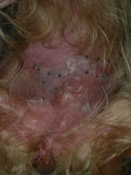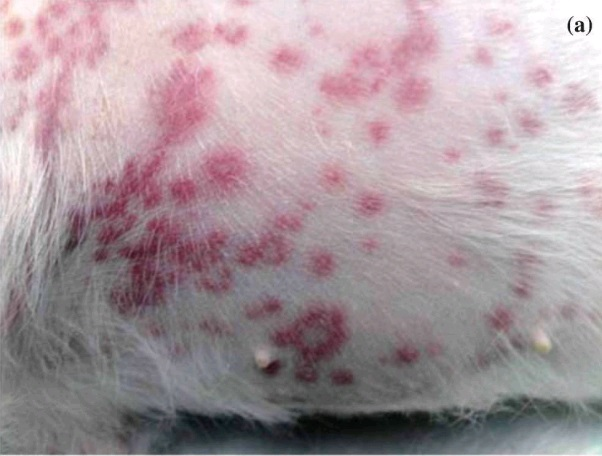 У большинства собак имелась гипоальбуминемия. Подобно случаям, описанным Holm с коллегами, клинические поражения представляли ярко красные, иногда мишеневидные (т.е. с центральным просветлением) макулы и папулы или бляшки с или без генерализованной эритемы и отека. Кожа вентральной части живота была постоянно и наиболее сильно поражена.