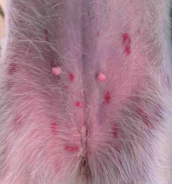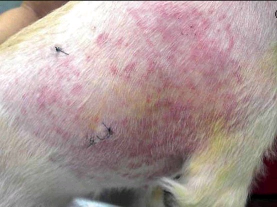 Фото 3. Вентральная часть живота у собаки с фото 2 с разбросанными геморрагическими макулами на диффузно эритематозной коже.