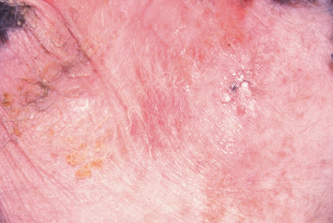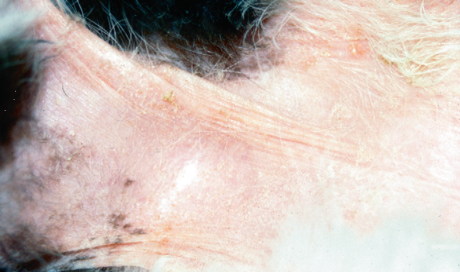 Фото 11 Паранеопластическая алопеция/дерматит кошек. Вид вблизи облысевшей кожи, демонстрирующее фокальное образование корочек. Могут быть видны воспалительные поражения, вдобавок к более характерной алопеции, ассоциированной с этим заболеванием.
