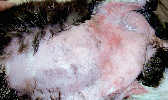 Фото 2 Паранеопластическая алопеция/дерматит кошек.Почти весь живот этой кошки с аденокарциномой поджелудочной железы быстро облысел. Также наблюдаются дискретные очаги эритематозного дерматита.