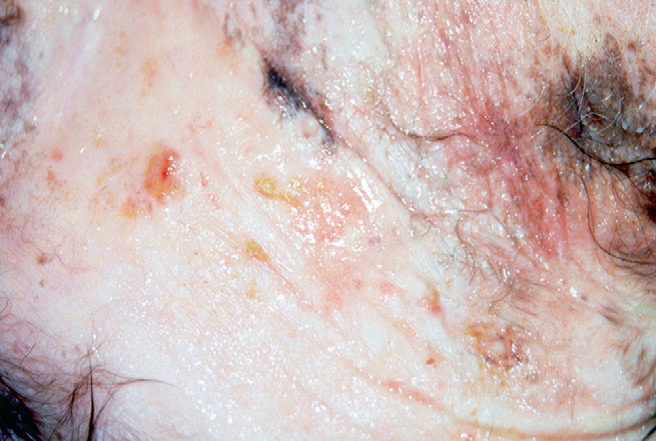 Фото 5 Паранеопластическая алопеция/дерматит кошек.Та же кошка с фото 2. Вид вблизи: мультифокальные эритематозные, макулярные, папулярные поражения с зонами формирования корок.