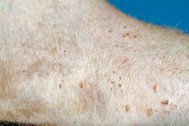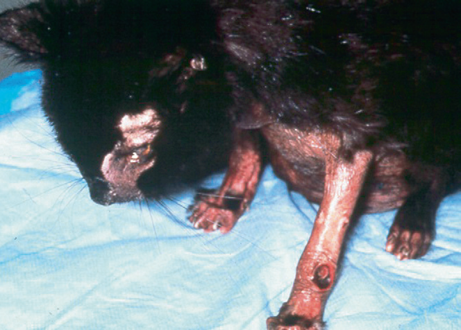 Этот синдром встречается у более старых кошек. Алопеция сначала появляется на вентральной части живота, грудной клетки и конечностях, а затем может генерализоваться. Иногда также могут повреждаться ушные раковины и периорбитальные регионы. Волосы, смежные с очагом выраженной алопеции, легко эпилируются. Кожа в очаге облысения имеет характерный гладкий, блестящий вид (Фото 1). Она тонкая и неэластичная, но не ломкая. Подушечки пальцев могут быть покрыты прозрачными чешуйками, скопления чешуек часто кольцевидной формы. Могут развиваться избыточный груминг и вторичный малассезионный дерматит. Симптомы одновременно протекающей неоплазии могут включать анорексию, потерю веса и летаргию.