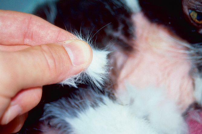 Фото 4 Паранеопластическая алопеция/дерматит кошек.Та же кошка с фото 2. Волосы легко эпилируются с небольшим усилием, приводя к большим зонам алопеции.