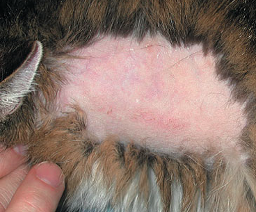 Фото 7 Паранеопластическая алопеция/дерматит кошек. Большая зона алопеции с гладкой, блестящей поверхностью кожи, характерной для этого синдрома. Поверхность кожи была влажной вследствие зуда и постоянного вылизывания кошкой.