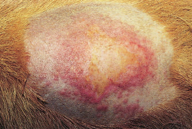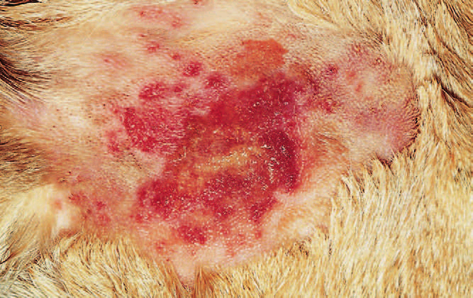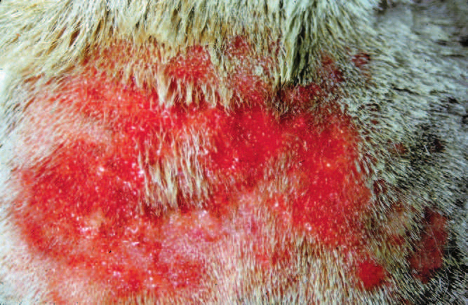 Фото 4. Пиотравматический дерматит собак и кошек. Раннее поверхностное поражение (после удаления шерсти) в поясничном регионе у собаки с аллергическим блошиным дерматитом. Папулы по периферии поражения говорят о распостраняющемся бактериальном фолликулите.